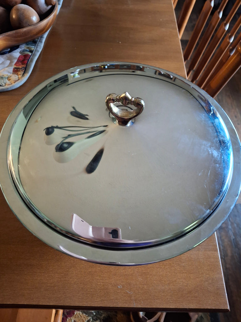 Stainless steel with brass handle on lid. Clean, nice, and like new. 19.50. Visit the website at the top of this page