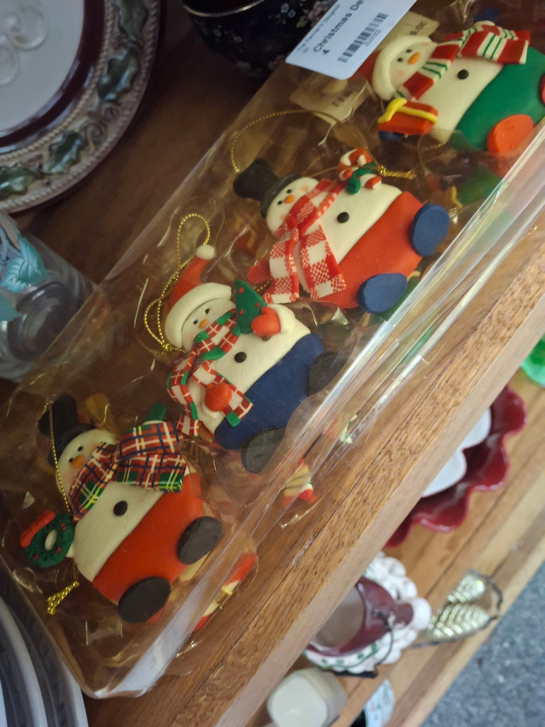 Pack of 4 porcelain Snowman ornaments are in perfect condition. Colorful and perfect for your Christmas decor, hand painted and nice. This is a great 5.00 price for these 4 ornaments. Your order of one will get you all package of 4 ornaments.