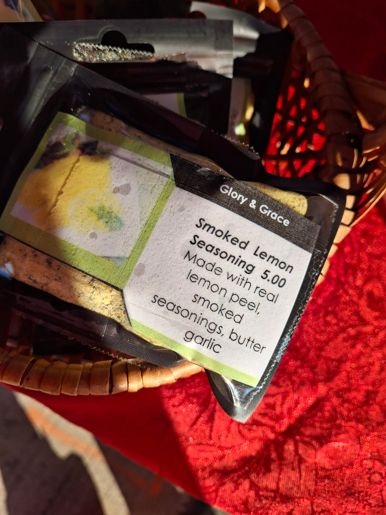 This is a wonderful homemade seasoning, blended with lemon peel, butter garlic, and our own homemade smoked seasonings. Great for any kind of meats and  vegetables.  Smoke asparagus on the grill. We love to smoke onions using this seasoning. Dig out the middle, pack it with butter and smoked Lemon Seasoning. Put the onion back together with the pieces you dug out. Lay it in foil on the grill or smoker. Don't wrap it. Just lay it in the foil and put the foil loosely around it,  leaving a small opening. Turns out so good. Great with any grilled or smoked meats for the meat lovers. You will receive 12 Oz of this product.